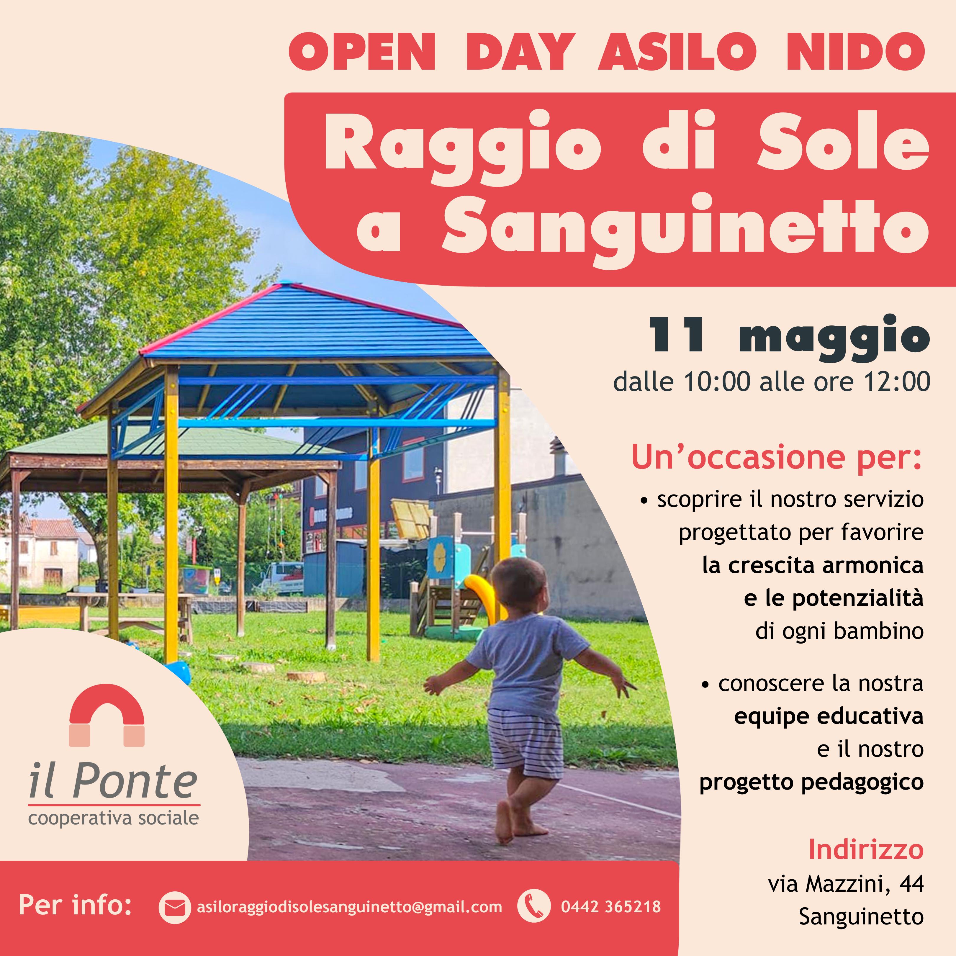 SABATO 11 MAGGIO dalle ore 10 alle ore 12 NIDO APERTO - Fino al giorno 20 GIUGNO 2024 si raccoglieranno le iscrizioni per il prossimo anno educativo 2024/2025 per l'Asilo Nido Integrato. La domanda si presenta all'Ufficio Servizi Scolastici, compilando il modulo allegato. Per chiarimenti consultare il bando oppure telefonare all'Ufficio Servizi Scolastici dalle ore 12.00 alle ore 13.00 al numero 0442 81066 oppure inviare una e-mail all'indirizzo scuole@comune.sanguinetto.vr.it